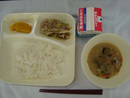 「豚肉とまいたけのいためもの つみれ汁 かぼちゃういろう ごはん 牛乳」