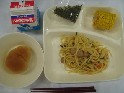 「ウインナーときのこのしょうゆ風味スパゲッティ 焼きとうもろこし 黒糖パン 牛乳」