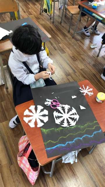 三角に折った紙を切って、雪の結晶を作っています!どんな形になるか想像しながら、切りました!「先生、こんな形ができたよ!」と笑顔で見せてくれました。