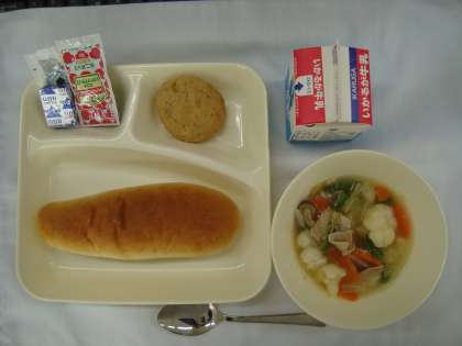 「とうふハンバーグ カリフラワーのスープ煮 固形チーズ コッペパン ブルーベリージャム ケチャップ」