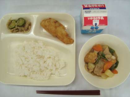 「たらのフライ 豚肉とあつあげの煮もの もやしときゅうりのおひたし ごはん 牛乳」