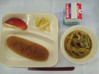 「カレーうどん はくさいのおひたし りんご こくとうパン 牛乳」