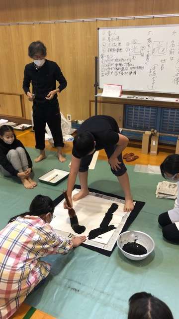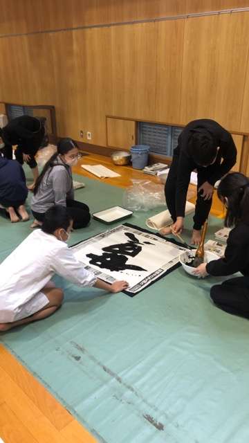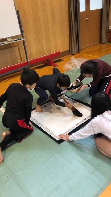 今日は、特大の筆で元気よく堂々と毛筆で書きました。