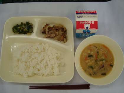「豚生のしょうが焼き さつまいものみそ汁 きくなとはくさいのごまあえ ごはん 牛乳」