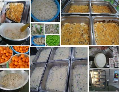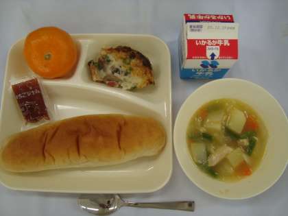 「鶏肉とじゃがいものスープ煮 きのこのドリア みかん コッペパン いちごジャム 牛乳」