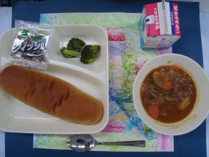 「ビーフシチュー ブロッコリーのサラダ ミニフィッシュ 黒糖パン 牛乳」