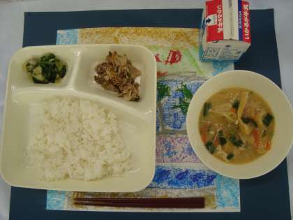 「豚肉のごまだれ焼き みそ汁 きくなとはくさいのおひたし ごはん 牛乳」