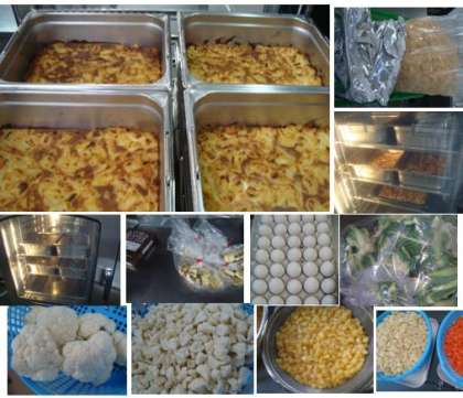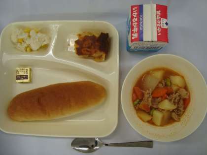 「鶏肉と野菜のケチャップ煮 カリフラワーのピクルス 桃のクラフティ コッペパン バター 牛乳」