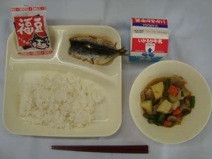 「いわしのしょうがじょうゆかけ 含め煮 いり大豆 ごはん 牛乳」(節分の行事献立)