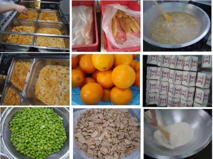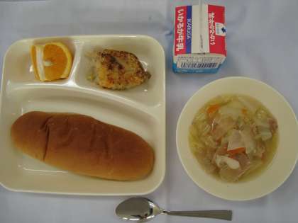 「押し麦のグラタン スープ いよかん 黒糖パン 牛乳」