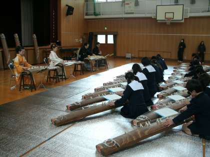 大阪音楽大学から菊武先生と和楽器を専攻されている大学生の方に来ていただき、素晴らしい演奏を聴いた後、6年生は春から練習してきたお琴「さくら」の合奏を聞いていただき、ご指導を受けました。学校のお琴の数は25面で、一度に全員が弾くことはできなかたのですが、この日は大学から足りないお琴をお借りできたので、クラス全員で合奏することができました。前半はそろうのですが、終わりの部分でゆっくりになるところがなかなかそろわず、いろいろアドバイスをいただきました。「音楽は自分が楽しむことが一番だよ。」という先生のお言葉に励まされて、最後は全員で気持ち良く演奏することができました。
