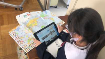 外国のことをタブレット端末を使って調べました。調べたことをもとにして聞き手に伝わるように外国のことを紹介する予定です。