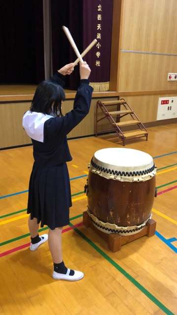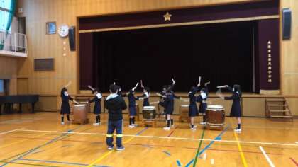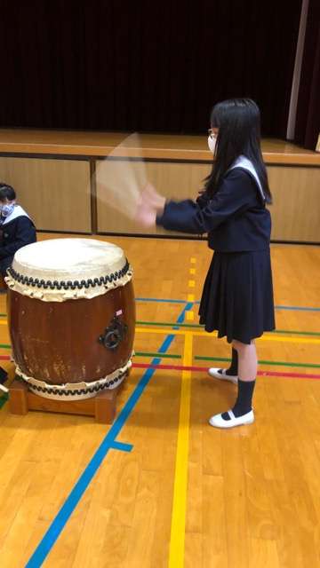 本校では、5年生で和太鼓、6年生でお琴を体験します。今日は、5年生が体育館で和太鼓の練習をしました。