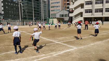春の陽気の中、1年生は体育で「たまごわりサッカー」をしました。