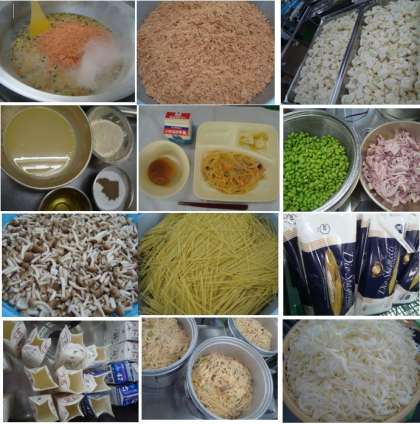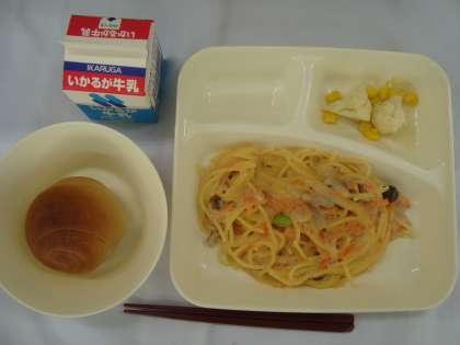 「さけのクリームスパゲティ カリフラワーとコーンのサラダ 黒糖パン 牛乳」