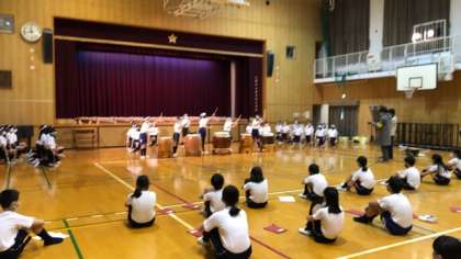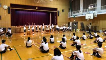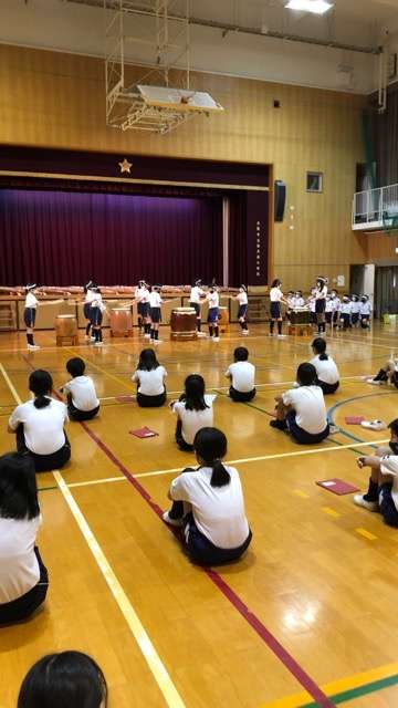 今日は、学習参観で保護者の方に披露するために練習してきた和太鼓を6年生に見てもらいました。