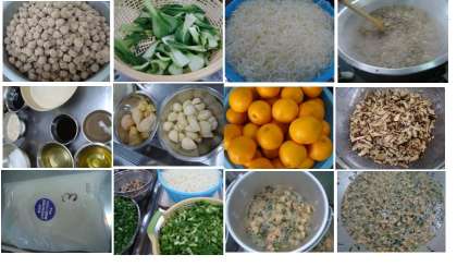 「えびと野菜のいためもの 中華がゆ はっさく 黒糖パン 牛乳」