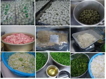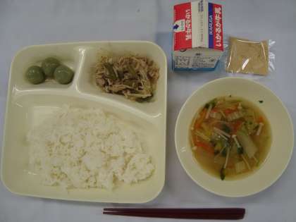 「豚肉と野菜のいためもの すまし汁 きなこよもぎだんご ごはん 牛乳」