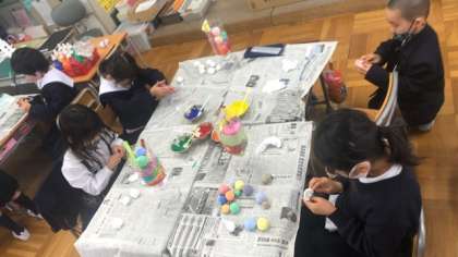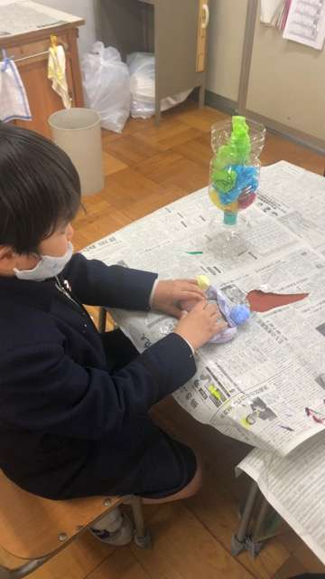 紙粘土に絵の具を混ぜ込んで、自分たちのお気に入りのパフェ作りました。