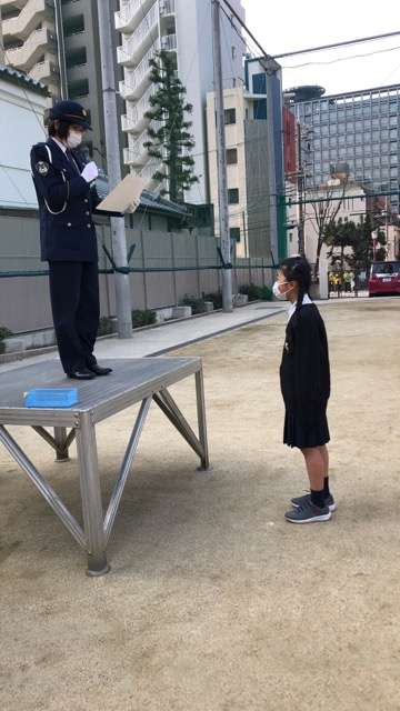 ※写真は、交通安全作文コンテストの受賞の様子。天満警察の方が全校児童の前で表彰してくださいました。
