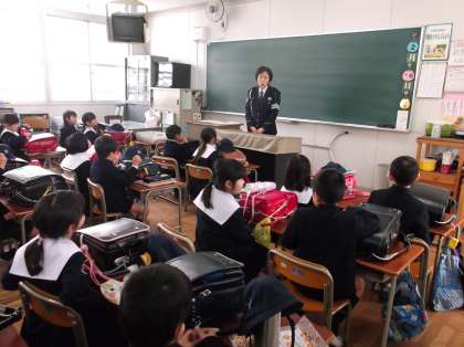 子ども達に、おじいちゃんやおばあちゃんへ交通安全を呼びかけてもらおうと天満警察の方々が1年生から3年生の子ども達へお願いに来られました。