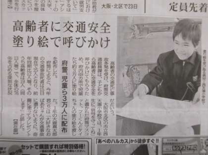 今年に入り、高齢者の交通事故が多発しているそうです。府警マスコットのフーくんとケイちゃんの絵が描かれたプリントを子ども達が塗り絵をして、おじいちゃんやおばあちゃんへプレゼントしてねというお話でした。子ども達は、さっそく家に持ち帰り、綺麗に色を塗って、一緒に住んでいるおじいちゃんやおばあちゃんにプレゼントしたようです。
