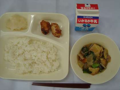 「鶏肉のチリソース焼き 中華煮 だいこんの中華煮 ごはん 牛乳」