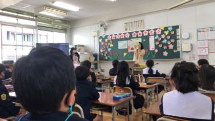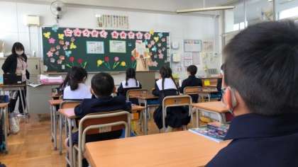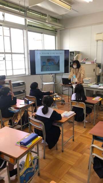 本校では、洋式トイレだけでなく、和式トイレがあります。電子黒板の映像を見ながらお話を聞きました。