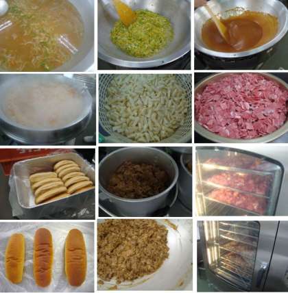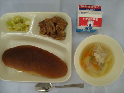 「豚肉のデミグラスソース スープ キャベツとコーンのソテー 黒糖パン 牛乳」