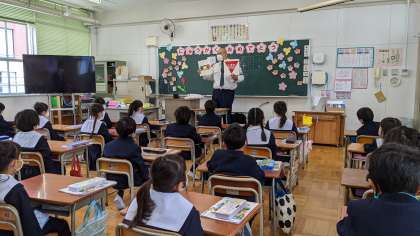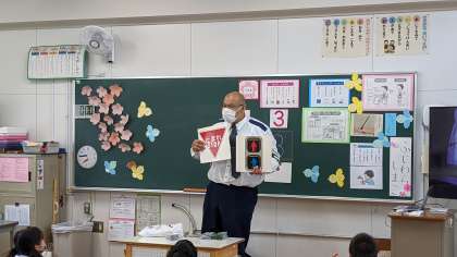 天満警察署交通課のおまわりさんが1年生に交通安全についてのお話をしてくださいました。