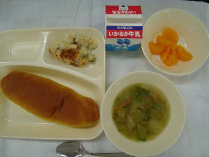 「マカロニグラタン レタスのスープ みかん(缶) パンプキンパン 牛乳」