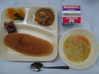 「煮こみハンバーグ コーンスープ 焼きかぼちゃ コッペパン いちごジャム 牛乳」