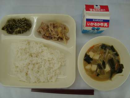 「豚肉のしょうが焼き みそ汁 じゃこピーマン ごはん 牛乳」