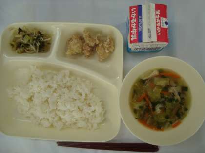 「鶏肉のから揚げ 中華スープ チンゲンサイともやしの甘酢あえ ごはん 牛乳」