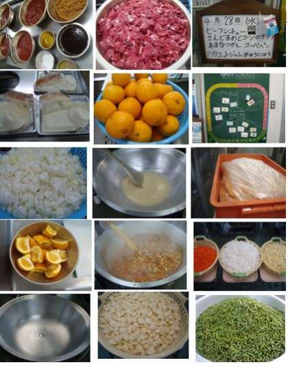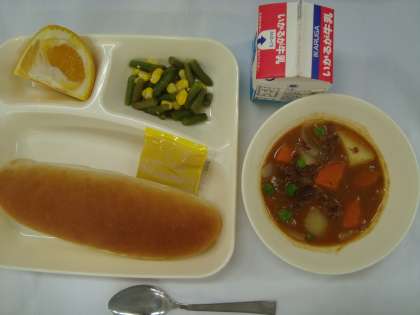 「ビーフシチュー さんどまめとコーンのサラダ 甘夏かん コッペパン アプリコットジャム 牛乳」