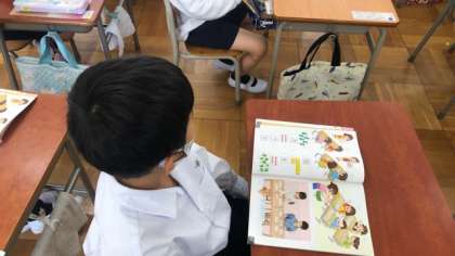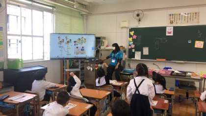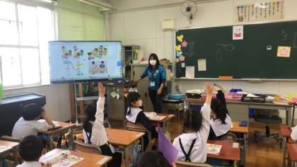 先程、学習したことの練習問題をしました。学校では、積極的に電子黒板を使って、視覚的に分かるよう学習しています。