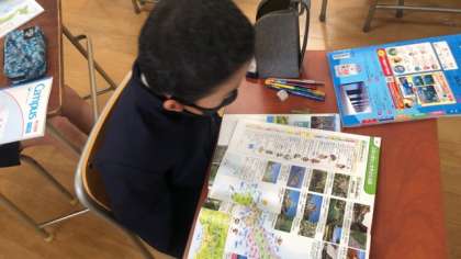 「さまざまな地形によって、食生活が違うんだよ!」という先生の話から授業がスタートしました。「バッタや蜂を食べる県もあるんだよ」という話をすると子どもたちは興味津々でした。