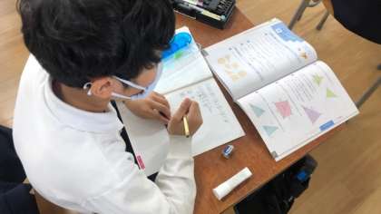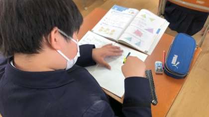 児童から、「多角形の内角を求めるときに、三角形の内角の和を応用して計算すればいいけどミスがないようにしないといけない」と言いながら、問題に取り組みました。