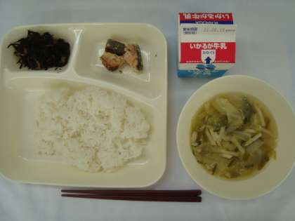 「さけのごまみそ焼き 五目汁 ひじきのいため煮 ごはん 牛乳」