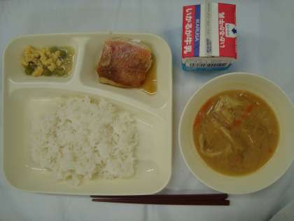 「あかうおのしょうゆだれかけ みそ汁 えんどうの卵とじ(個別対応:鶏卵)ごはん 牛乳」