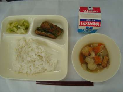 「ちくわのいそべあげ あつあげとさといもの煮もの あっさりキャベツ ごはん 牛乳」
