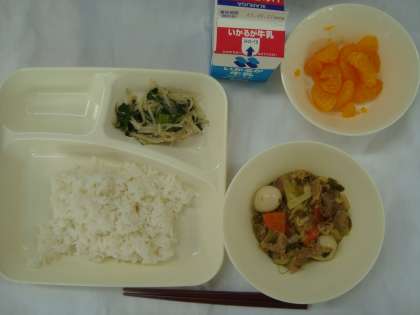 「八宝菜(個別対応献立:うずら卵) チンゲンサイともやしの中華あえ みかん(缶詰) ごはん 牛乳」