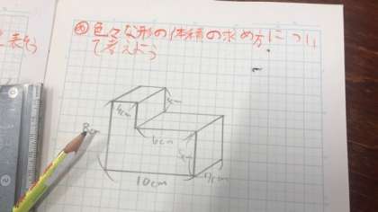 今日は、直方体や立方体が合わさった形の体積の求め方を考えました。
