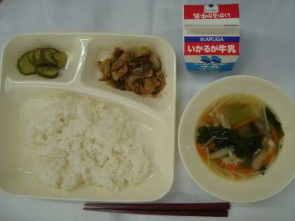 「ホイコウロー 中華スープ きゅうりの中華あえ ごはん 牛乳」