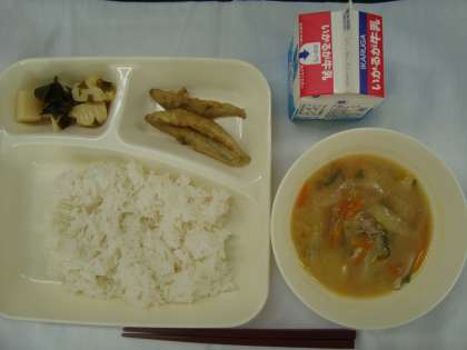 「きびなごのてんぷら 豚汁 わかたけ煮 ごはん 牛乳」