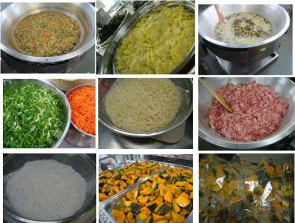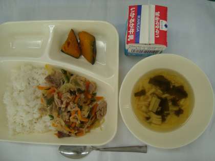 「豚丼 湯葉のすまし汁 かぼちゃのしょうゆ焼き ごはん 牛乳」