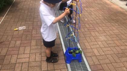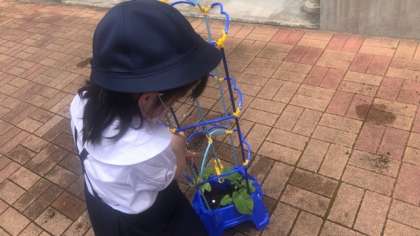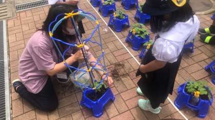 今日は、朝顔の芽がたくさん出ていたので、間引きをしました。また、支柱も立てて、これから大きく育つようにお世話をしました。