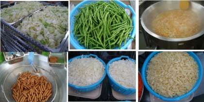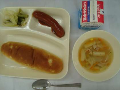 「ウインナーのケチャップソース スープ キャベツとさんどまめのサラダ おさつパン 牛乳」