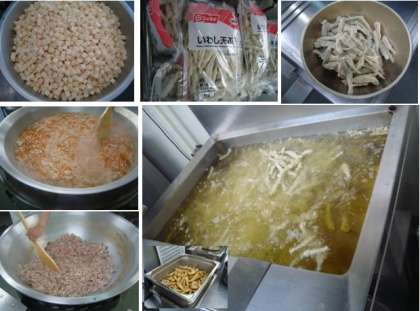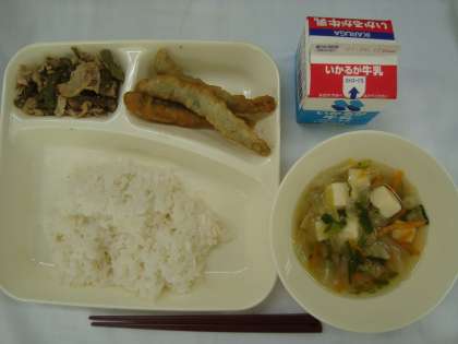 「いわしてんぷら 五目汁 豚肉とさんどまめのいためもの ごはん 牛乳」