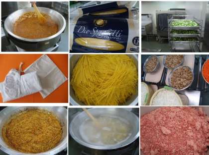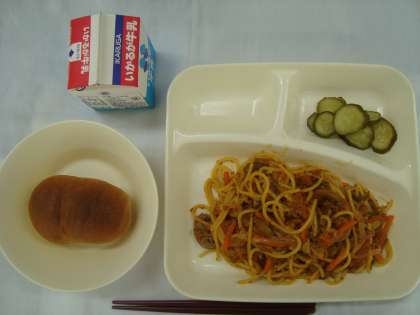 「スパゲッティミートソース きゅうりのピクルス 黒糖パン 牛乳」
